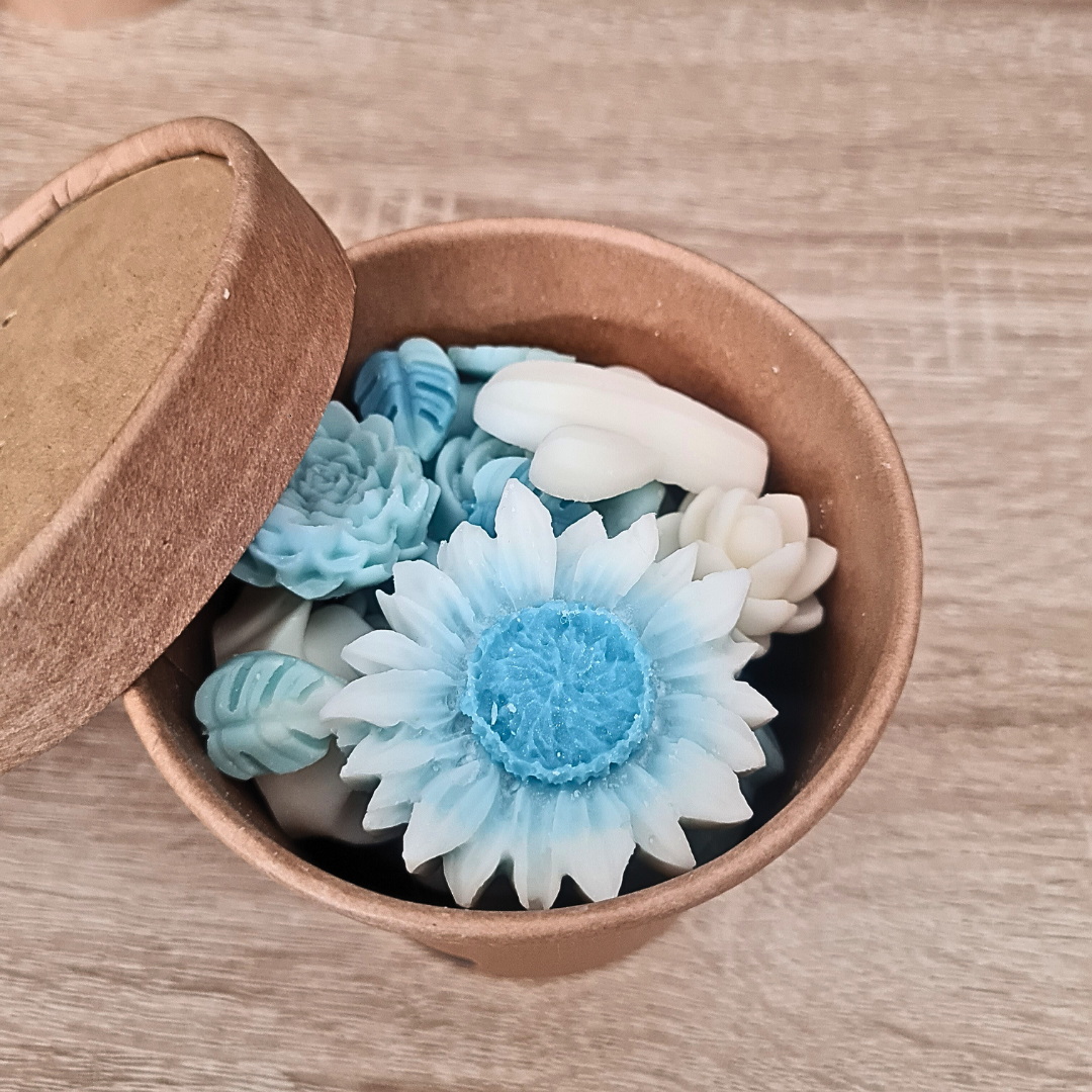 Découvrez La Box Flora, un assortiment de 100 g de fondants parfumés aux formes florales, coulés à la main à Carcassonne en cire de soja 100 % végétale enrichis de parfums de Grasse, garantissant une diffusion olfactive douce mais présente dès les premières minutes de fonte.