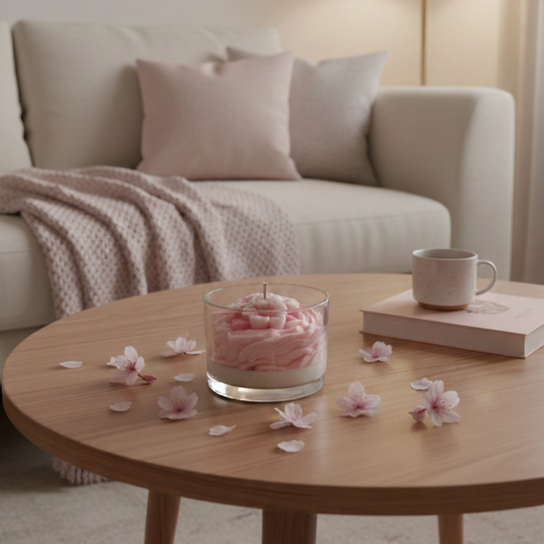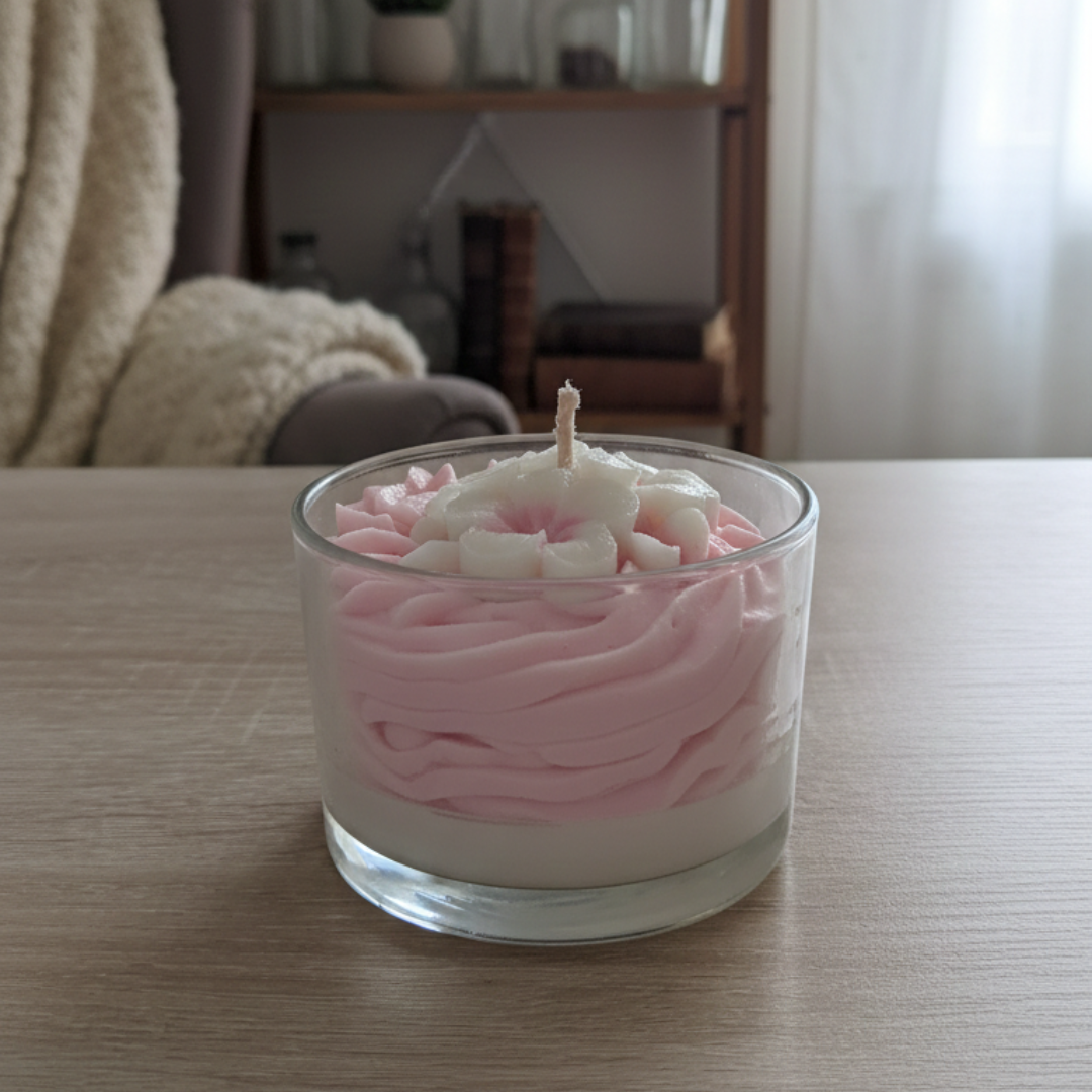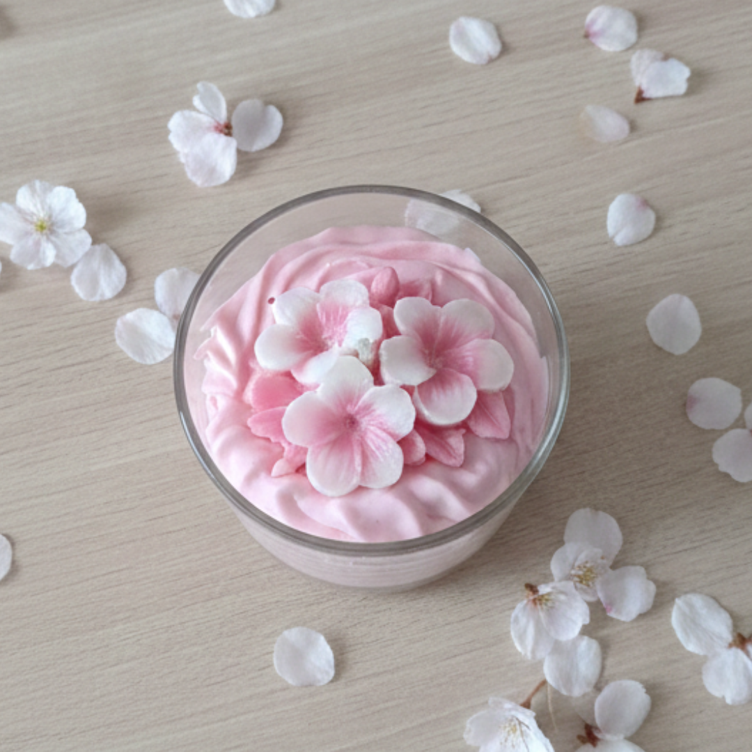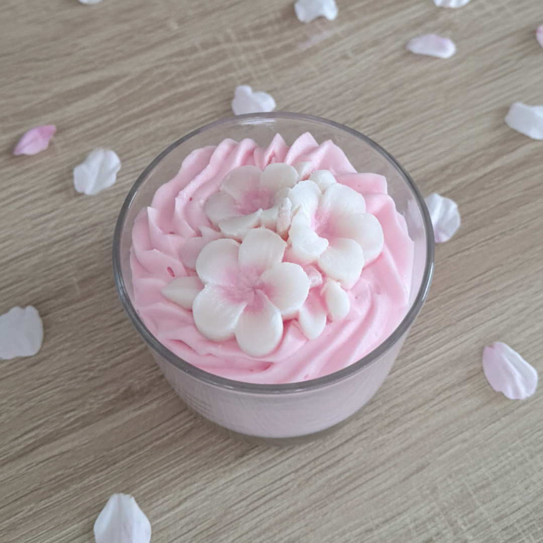 Découvrez nos bougies de la Collection Sakura, chaque bougie est délicatement décorée d’une chantilly rose aérienne et de petites fleurs de cerisier en cire. Inspirée des paysages japonais au printemps, cette bougie apporte une touche poétique et raffinée à votre intérieur tout en diffusant un parfum délicat et apaisant.